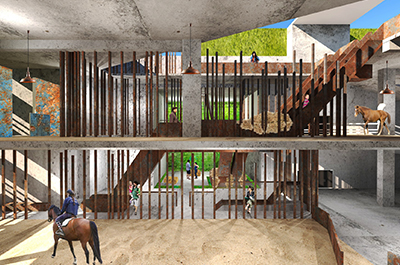 On the roof is a riding area, overlooked by a rooftop pavilion, from where the general public can watch therapy sessions and learn about the qualities of working with horses.