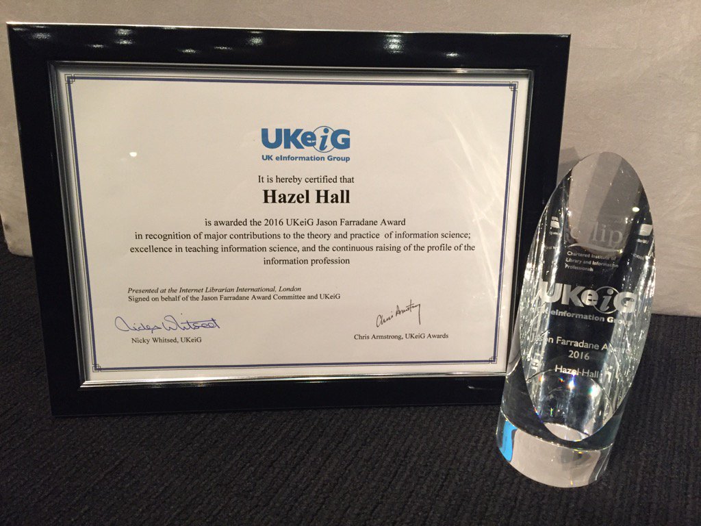 Presented to her at the recent Internet Librarian International Conference in London, Professor Hall received the Jason Farradane Award for 2016.