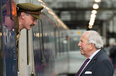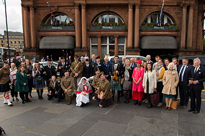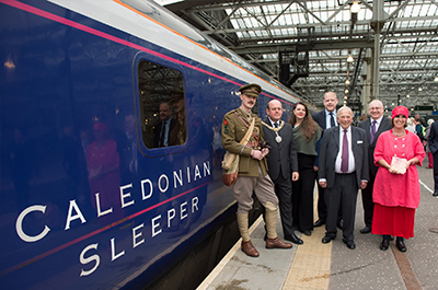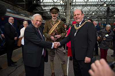Arriving at platform seven on the Caledonian Sleeper, the event saw Owen, played by historian and teacher David Clarke, welcomed to the city by the Rt Hon Lord Provost and Lord Lieutenant of the City of Edinburgh Frank Ross and Norman Drummond, chair of the Scottish Government’s First World War Commemoration panel. The Caledonian Sleeper party were accompanied by Owen’s nephew, Peter, who also made the train journey to be part of the centenary commemorations.