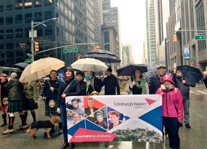 A pivotal part of the Week is the Parade. Edinburgh Napier alumni, friends and staff fly the flag for Scotland as they march down 6th Avenue to a chorus of bagpipes and drums.